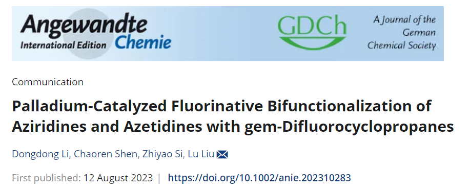 相关成果以“Palladium-Catalyzed Fluorinative Bifunctionalization of Aziridines and Azetidines with gem-Difluorocyclopropanes”为题于2023年8月12日在线发表于Angewandte Chemie International Edition上 (DOI: 10.1002/anie.202310283)。黄色网站 2019级博士研究生李冬冬为论文第一作者,沈超仁副研究员为共同一作,刘路教授为论文通讯作者,硕士生司志姚也参与此课题的研究。该项工作得到了国家自然基金科学委和上海市科委项目资助。