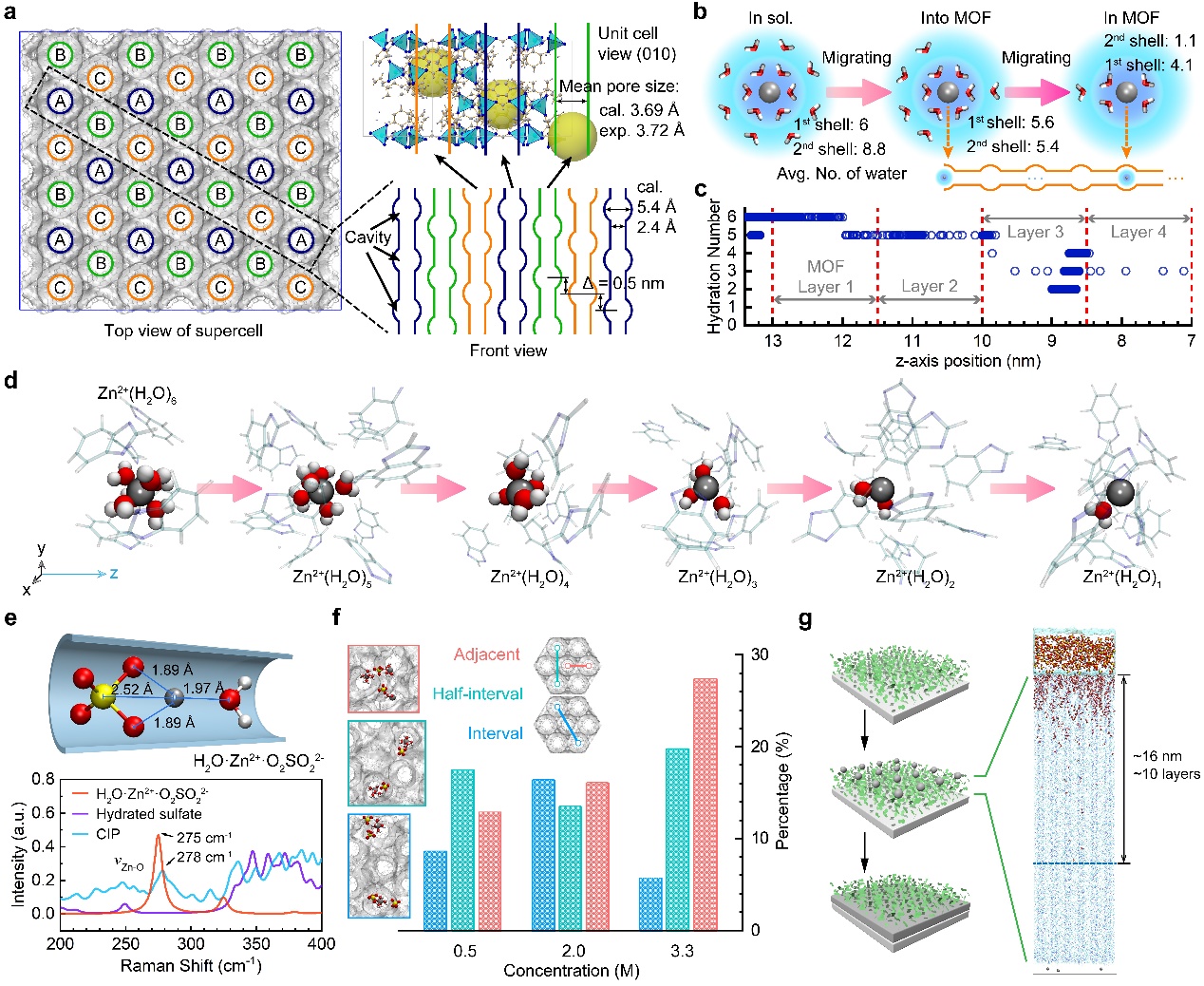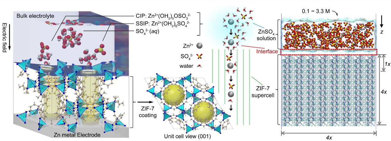 近日,黄色网站 的何晓教授和杨金荣副研究员团队聚焦这一底层机制,以ZnSO4电解液和沸石咪唑酯骨架ZIF-7负极保护膜为概念验证,使用理论计算模拟系统探讨了其电解液结构,揭示了溶剂化水合锌离子通过膜层逐步脱水的机理,并据此提出了降低膜厚度至~16 nm和在ZIF-7表面修饰亲水基团来降低脱水,加速锌离子扩散的策略。相关工作在线发表在化学领域顶级期刊《德国应用化学》上(Angew. Chem. Int. Ed. 2023, e202307274),并被评为VIP文章(Very Important Paper)。