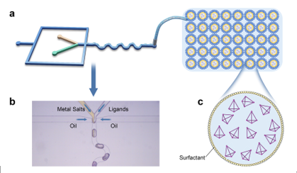 图2. (a) 通过微纳流控技术制备尺寸均一的微液滴示意图;(b) 通过微纳流控技术在线制备W/O微液滴的显微镜图像。(c) 微液滴及其空腔内金属笼的示意图。