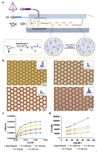 图4. (a) 通过微纳流控技术在微液滴中实现金属笼1的催化开环反应示意图;(b) 使用不同的微纳流控液滴芯片制备的四种不同尺寸的高分散性、高均一性的微液滴;(c) 传统开放环境中(反应瓶中)和四种不同尺寸微液滴中超分子催化的Michaelis-Menten图;(d) 传统开放环境中(反应瓶中)和四种不同尺寸微液滴中超分子催化的Lineweaver-Burk图。