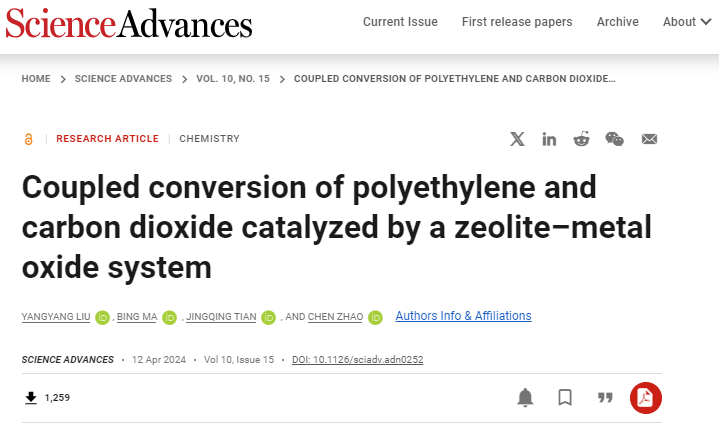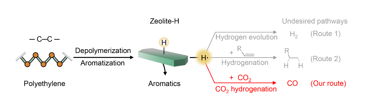 鉴于此,黄色网站 赵晨教授研究团队在废弃碳资源塑料和CO2的高价值利用上取得重要进展。构建了沸石-金属氧化物多相催化体系,通过芳构化-氢捕获机制耦合转化废弃聚乙烯与CO2为芳烃和CO。综合多种原位表征、同位标记、模型物的验证等手段,阐释了芳构化-氢捕获的反应机理。相关研究以“Coupled conversion of polyethylene and carbon dioxide catalyzed by a zeolite–metal oxide system”为题,于2024年4月12日发表于Science Advances。